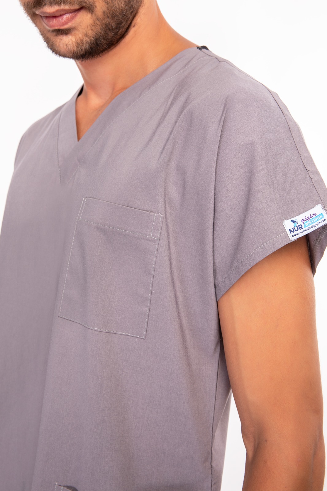 Likralı Gri Erkek Medikal Üniforma, sağlık çalışanlarının uzun nöbetlerde rahat hissetmesi için özel olarak tasarlandı. Nefes alabilen kumaşı, esnek yapısı ve modern desenleriyle doktor, hemşire ve tüm sağlık personeli için idealdir.