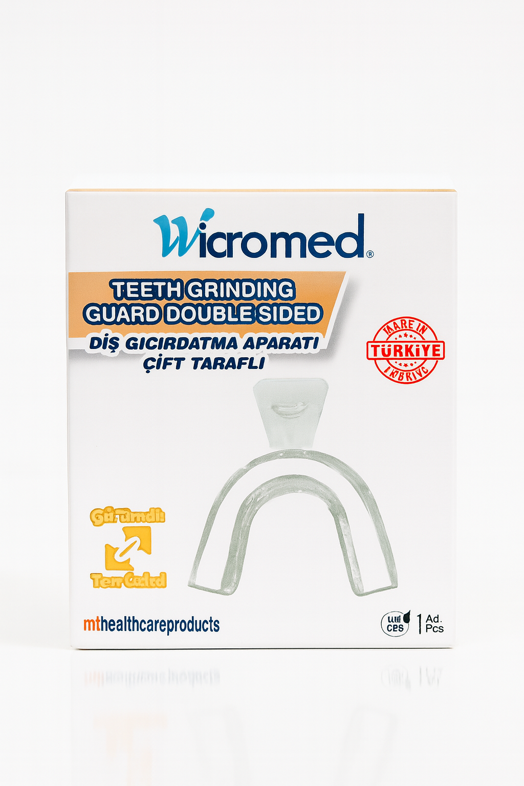 Wicromed Çift Taraflı Diş Gıcırdatma Aparatı, gece boyunca diş sıkma ve diş gıcırdatma (bruksizm) problemlerini azaltmaya yardımcı yenilikçi bir gece plağıdır. Medikal sınıf, BPA içermeyen esnek materyali sayesinde üst ve alt diş yapınıza kolayca uyum sağlar ve çene eklemine binen baskıyı dengeli bir şekilde azaltır. Çift taraflı tasarımı ile hem sağ hem de sol diş sıralarını aynı anda koruyarak maksimum konfor ve etkinlik sunar. Diş minesini koruyarak sabah çene ağrısı, baş ağrısı ve diş hassasiyeti gibi şikâyetleri önlemeye yardımcı olur. Şeffaf, hijyenik ve kolay temizlenebilir yapısı ile günlük kullanıma uygundur.